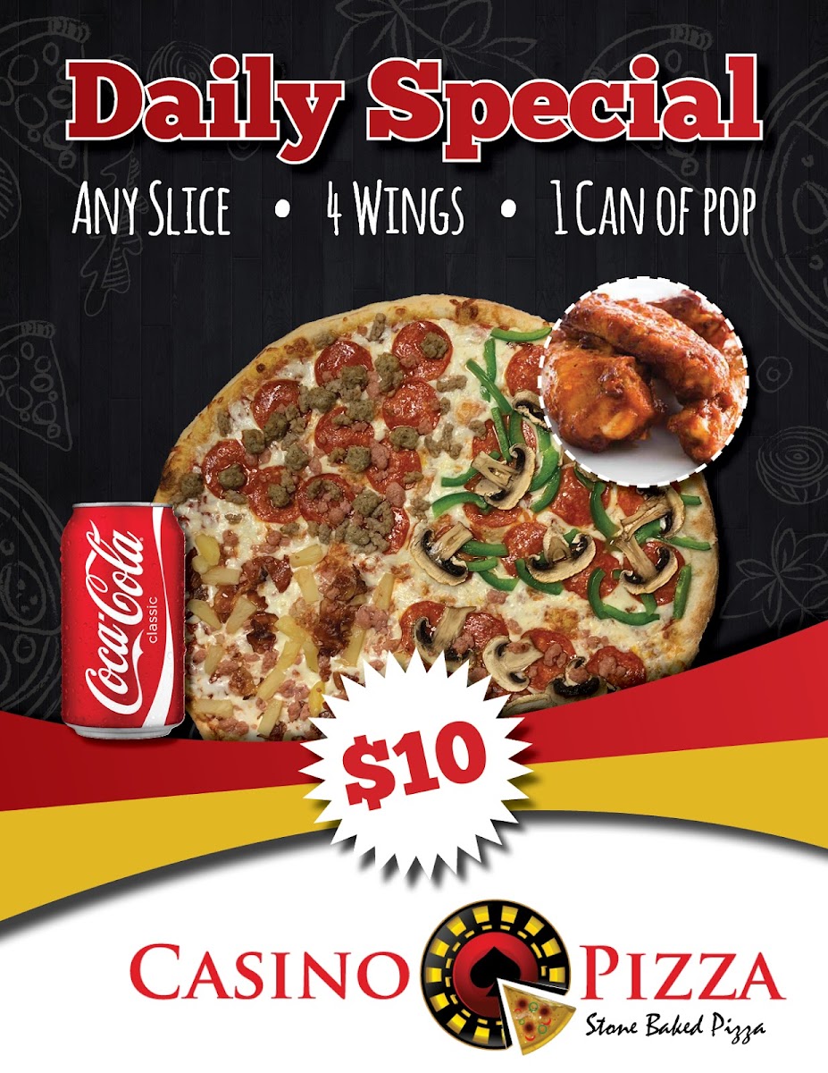 Casino Pizza offers a diverse menu catering to various tastes, making it a great spot for casual dining in Pickering. For pasta lovers, the Lasagna With Garlic Bread (6 Inch) is a delicious option. When it comes to sides, there are plenty of choices, including Pizza Slice, Chicken Strips (6 Pcs), Garlic Bread With Cheese Fries, and the classic Garlic Bread. Their pizza menu is extensive, with options like the Small Pizza (3 Toppings), Large Pizza (1 Topping), Extra Large Pizza (3 Toppings), and Medium Pizza (3 Toppings), catering to all preferences. Signature pizzas such as Meat Lovers, Canadian Eh!, BBQ Chicken Sweet Chilli Heat Chicken, and the Casino Special stand out, each offering a unique combination of flavors. For dipping sauces, you can choose from Sweet Chilli Thai, Garlic Sauce, Cheddar Jalapeno Ranch, Hot Sauce, and more. If you're in the mood for something different, their Chicken Burger and a variety of subs, including Pizza (6 Inch), Steak (6 Inch), Chicken & Steak (6 Inch), and Chicken (6 Inch), offer filling and satisfying meals. Vegetarians can enjoy the Veggie (6 Inch) sub. To quench your thirst, Casino Pizza also offers a selection of beverages like Cplus Orange (355ml Can), Sprite (355ml Can), Nestea (355ml Can), Coke (355ml Can), and Root Beer (355ml Can). Overall, Casino Pizza provides a wide array of options that appeal to all types of cravings.